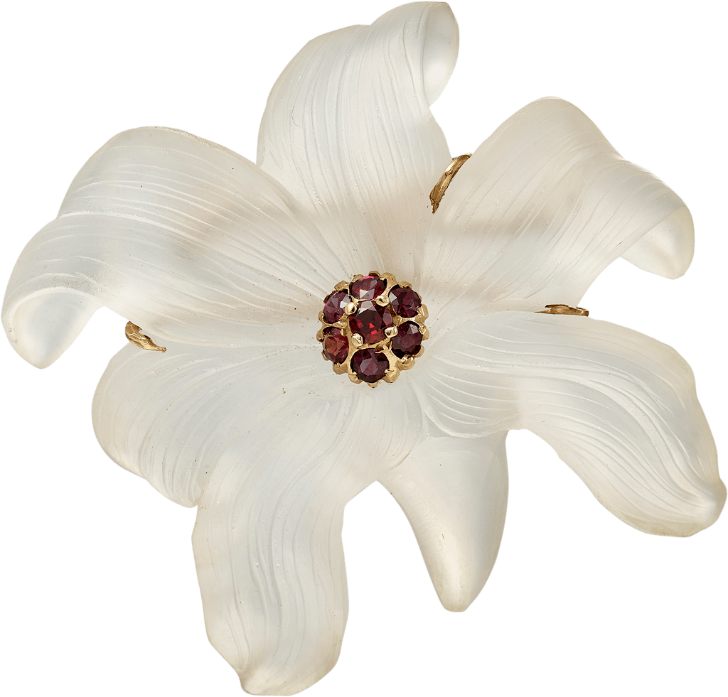 The main body of this brooch is made from opaque glass. In its centre is a small cluster of seven garnets forming the stamens of the flower. The glass has been carved to give texture to the petals. I bought this brooch from Hanson’s auction. Hanson’s is run by the charismatic auctioneer Charles Hanson, whose flamboyant character is often seen on television in programmes like Bargain Hunt, Flog It and Antiques Road Trip.