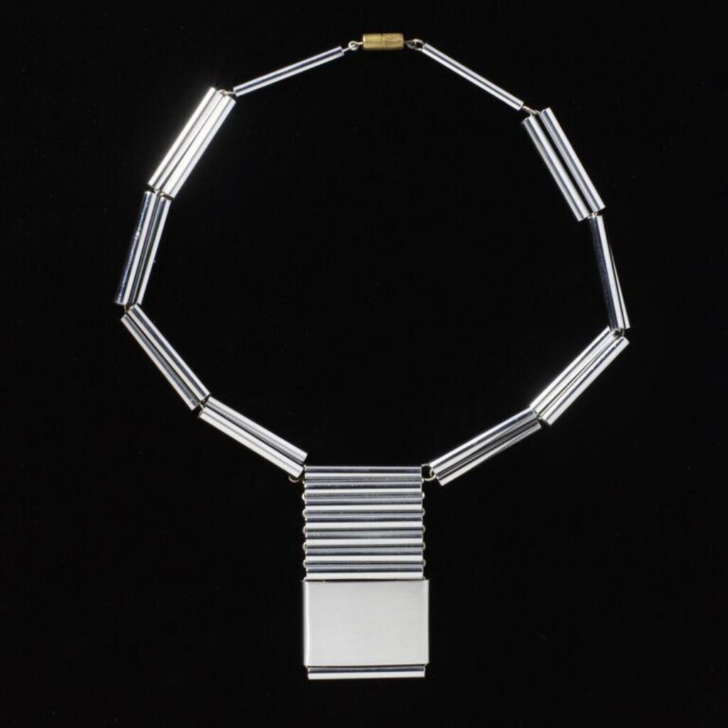 Bauhaus is often associated with modernist architecture, but the influence of the school spread across all disciplines of design including jewellery. Rejecting previous decades of elaborate decoration, ornamentation and precious/semi-precious gemstones, Bauhaus jewellery designers emphasised the beauty of the materials moving away from the intrinsic value to the artistic merits of the design. One of the defining characteristics of Bauhaus jewellery is its use of geometric forms – circles, squares, triangles and spheres – these are the basic building blocks of the designs. Naum Slutzky born 28 February 1894 in Kyiv, Ukraine (died England 4 November 1965) trained as a goldsmith, and was part of the Bauhaus school. The V&A in London has one of his necklaces on show in their jewellery galleries.