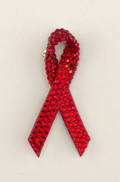 James Arpad originally wanted to be an architect but shifted into creating fashion accessories. He is widely known for designing earrings, but he did do other pieces of jewellery. His designs were sold in New York and San Fransico. In 1992 James designed and made pins made of red leather and decorated with ‘pave’ set rhinestones. They were sold for hundreds of dollars in support of AIDS, Elizabeth Taylor wore one of these pins at a charity event in 1992. One of James Arpad’s original AIDS pins is now housed at the Smithsonian Design Museum Collection. There are a number of red ribbon style AIDS pins in the collection.