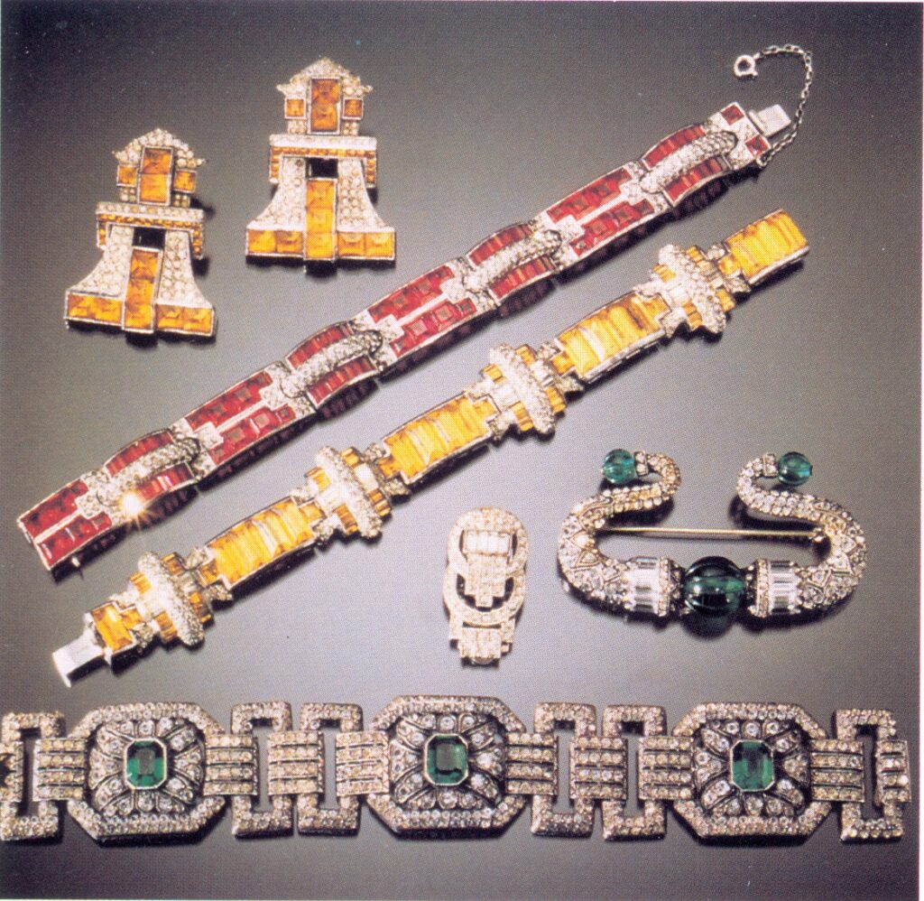 I bought this brooch near 10 years ago from a dealer in America. When I first saw the brooch it was in a bad way, bent, stones missing and a broken clasp. So why did I buy a brooch in such a bad state? It is what is known as a ‘Book Piece’, which means it is mentioned in a respected reference book. The book in question is by Ginger Moro entitled ‘European Designer Jewelry’ published in 1995 by Schiffer Publishing ltd. It can be found on page 50 of the book, in the section headed Chapter 1 France. Ginger Moro describes the brooch as “Cartier-style ‘doorknocker’ silver brooch with melon-cut ‘emeralds’ and crystal and marked ‘Made in France’.”