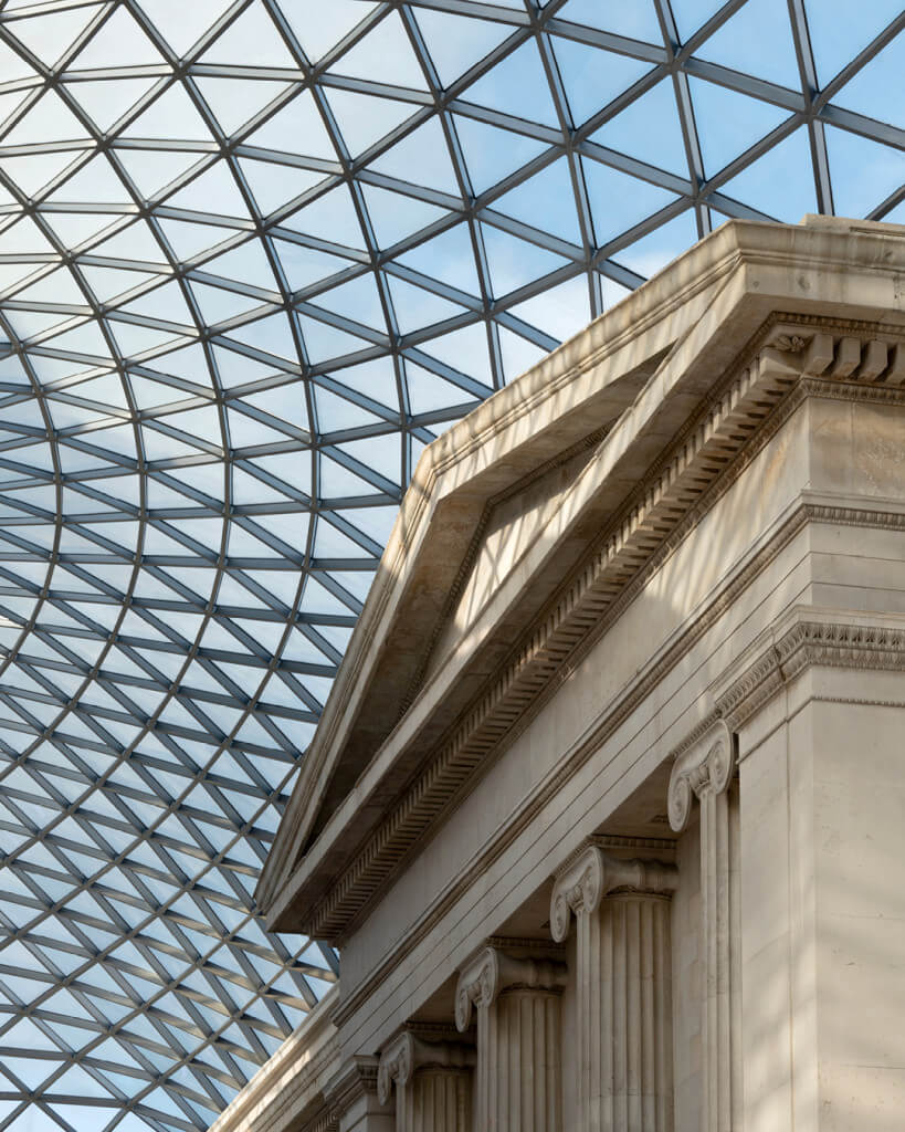 The Great Court with its magnificent glass roof structure designed by Foster + Partners, engineered by Buro Happold and built by Waagner-Biro was opened on 6 December 2000. There are 3,312 individual panels of glass held together by four miles of steel, this is enough glass to glaze 500 domestic greenhouses. So that the roof can cope with changes in temperature it is attached to the perimeter walls with sliding bearings allowing it to expand or contract and not break. The Great Court is two acres and is the largest covered square in Europe. It takes two weeks to clean the whole roof.